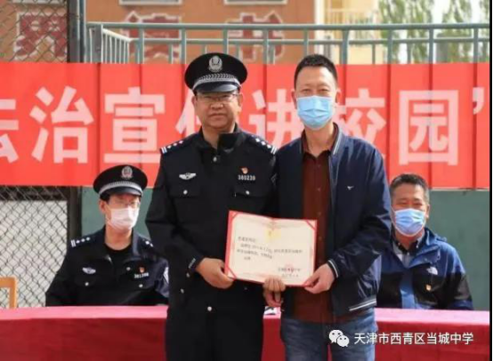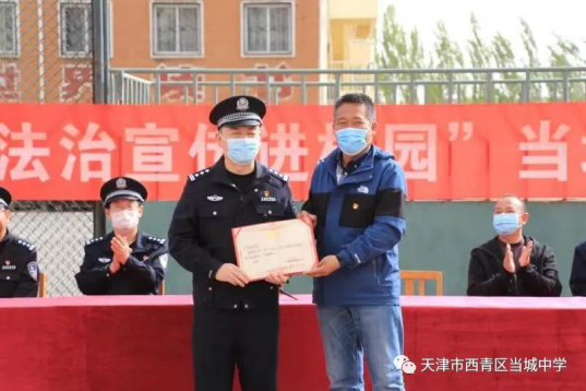 兰东副校长、孙国旺副主任分别向于艳泉同志、李建军同志分别颁发了西青区当城中学法治校长和法治辅导员的聘书。