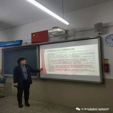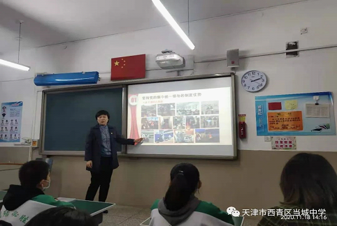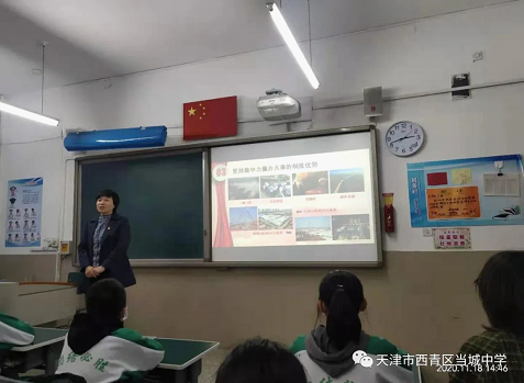 为深入贯彻落实习近平总书记在学校思想政治理论课教师座谈会上的重要讲话精神,进一步推进领导干部进校园开展思想政治工作。2020年11月18日,人力资源与社会保障局局长刘月华来到天津市西青区当城中学以《疫情“大考”彰显中国制度优势》为题,为七年级的学生讲了一堂深入浅出、丰富详实的思政课。