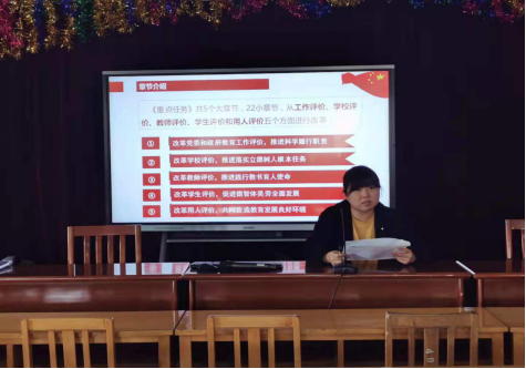 《深化新时代教育评价改革总体方案》是新中国第一个关于教育评价系统改革的文件,也是指导深化新时代教育评价改革的纲领性文件。《总体方案》从党中央关心、群众关切、社会关注的问题入手,破立并举,推进教育评价关键领域改革取得实质性突破。通过学习,老师们纷纷表示要深刻理解领会《总体方案》精神,结合各自的工作实践,不断摸索完善本学科的评价办法,形成可操作的规章制度与细则。