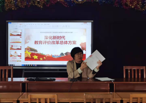 2021年4月25日,在学校大会议室召开了全体教师会,边金玲书记兼校长主持会议。会上邀请我校刘昕老师为全体教师作了关于《深化新时代教育评价改革总体方案》的培训。