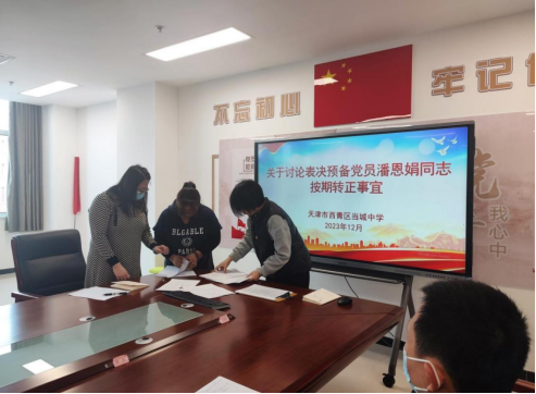2023年12月11日,学校党支部在三楼会议室举行了“纳新聚力,砥砺前行”主题党日活动,主要议程是讨论表决预备党员张红、潘恩娟同志的转正事宜。