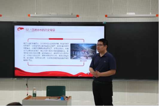 随后,区人社局党建办青年干部张文迪为大家讲授了微党课《再忆长征峥嵘,汲取奋进伟力——四渡赤水出奇兵》。他以战争沙盘的形式,从政治、军事和历史等不同角度与大家重温了“四渡赤水”战役经过,共同回首那段峥嵘岁月,领悟长征精神的磅礴伟力。与会师生纷纷表示,不仅要从中学习无数革命先辈不畏牺牲、顽强拼搏、鞠躬尽瘁、死而后已的奋斗精神,更要学会总结历史经验、传承红色基因,持续用敢于斗争、敢于胜利的精神滋养自己、激励自己。
