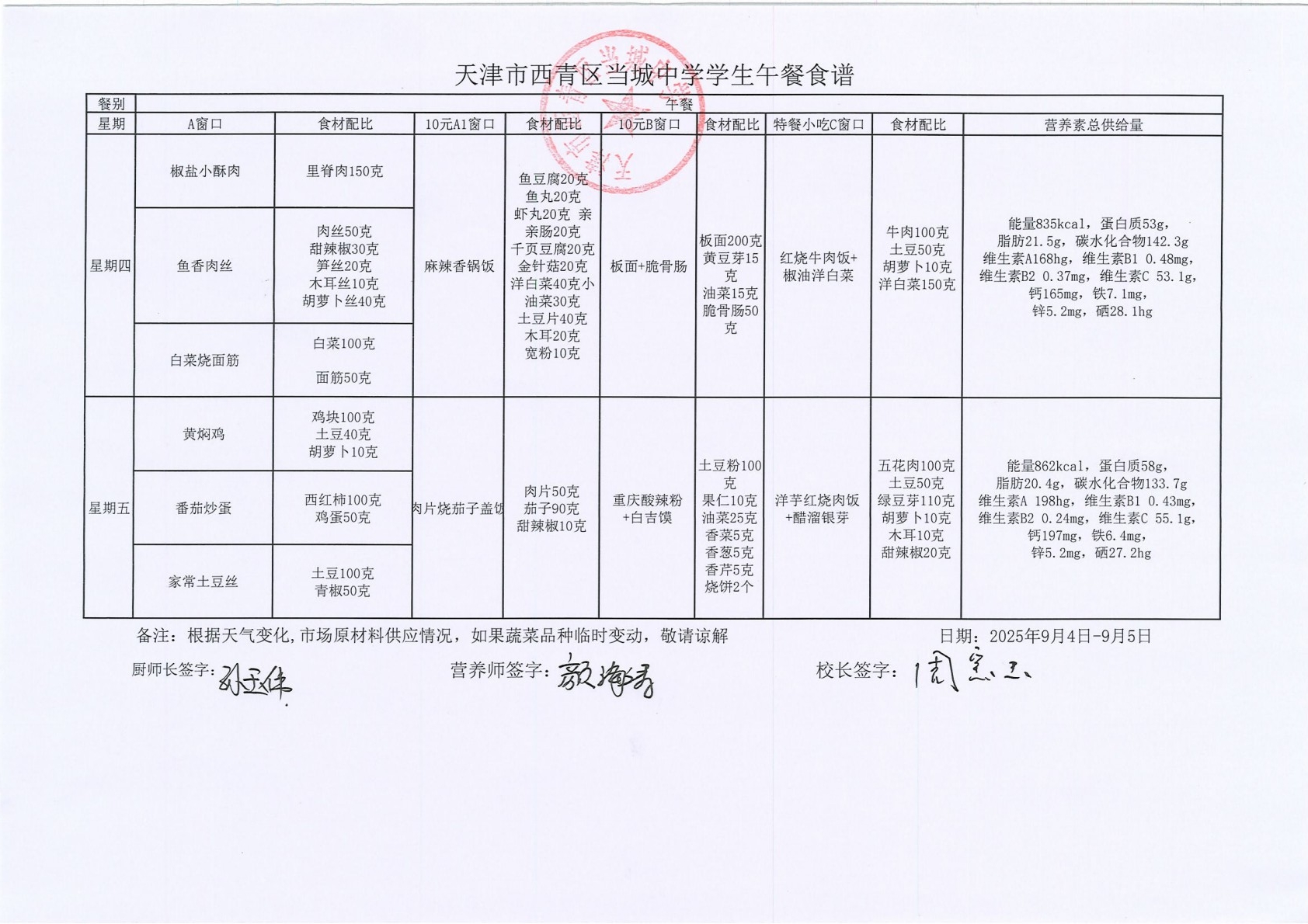 当城中学2025年9月4日-9月5日学生午餐食谱