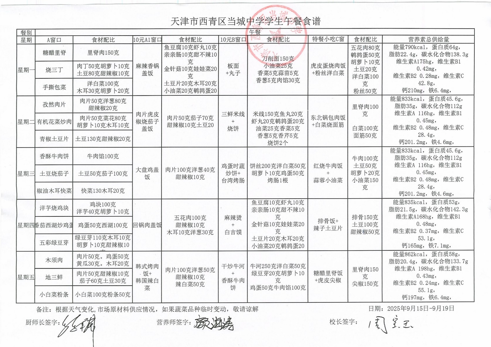 当城中学2025年9月15日-9月19日学生午餐食谱