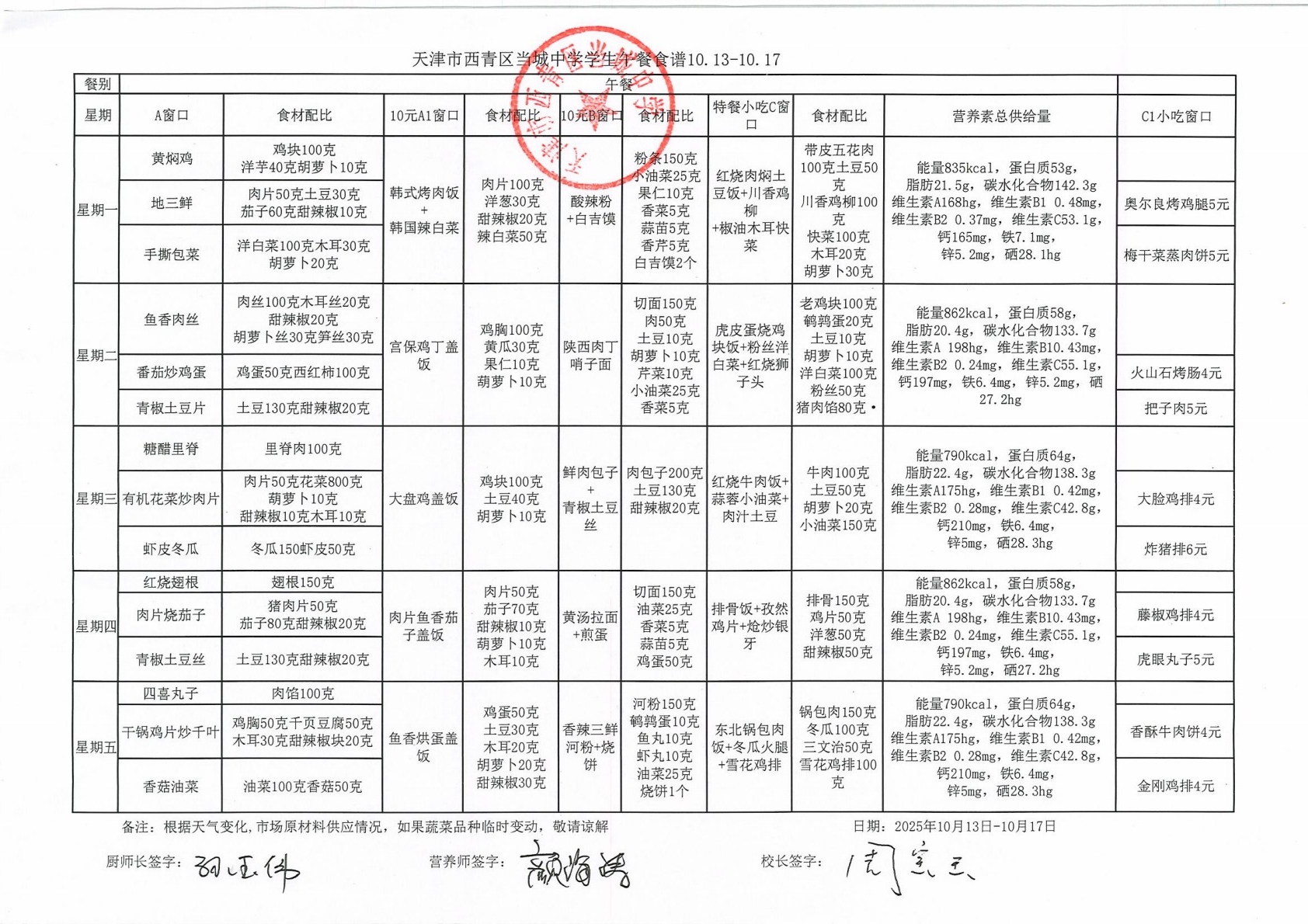 当城中学2025年10月13日-10月17日学生午餐食谱