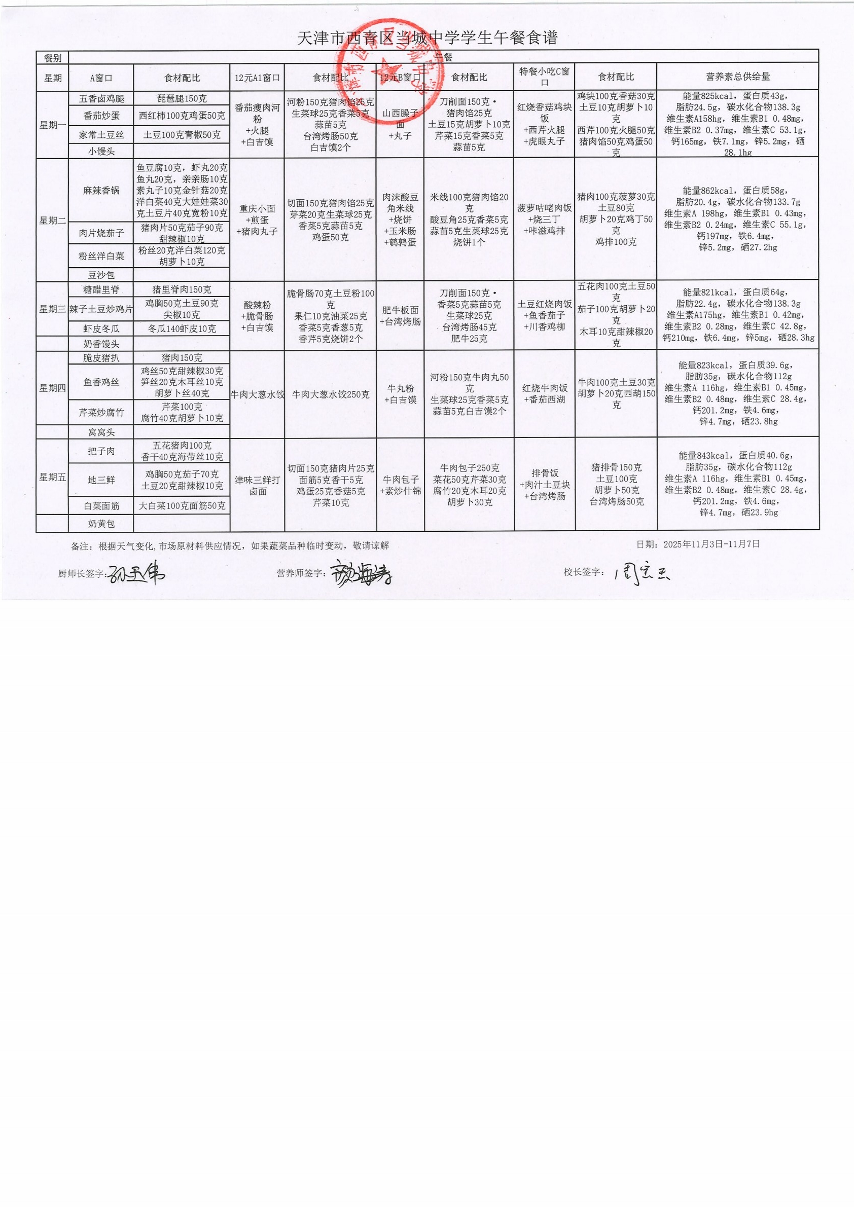 当城中学2025年11月3日-11月7日学生午餐食谱