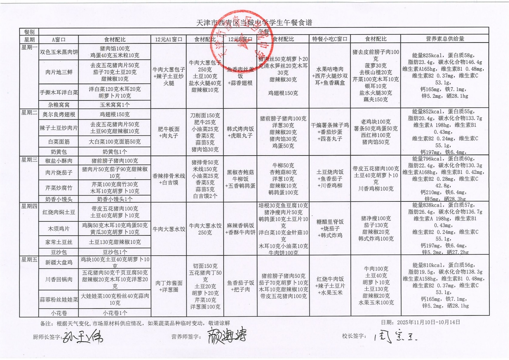当城中学2025年11月10日-11月14日学生午餐食谱