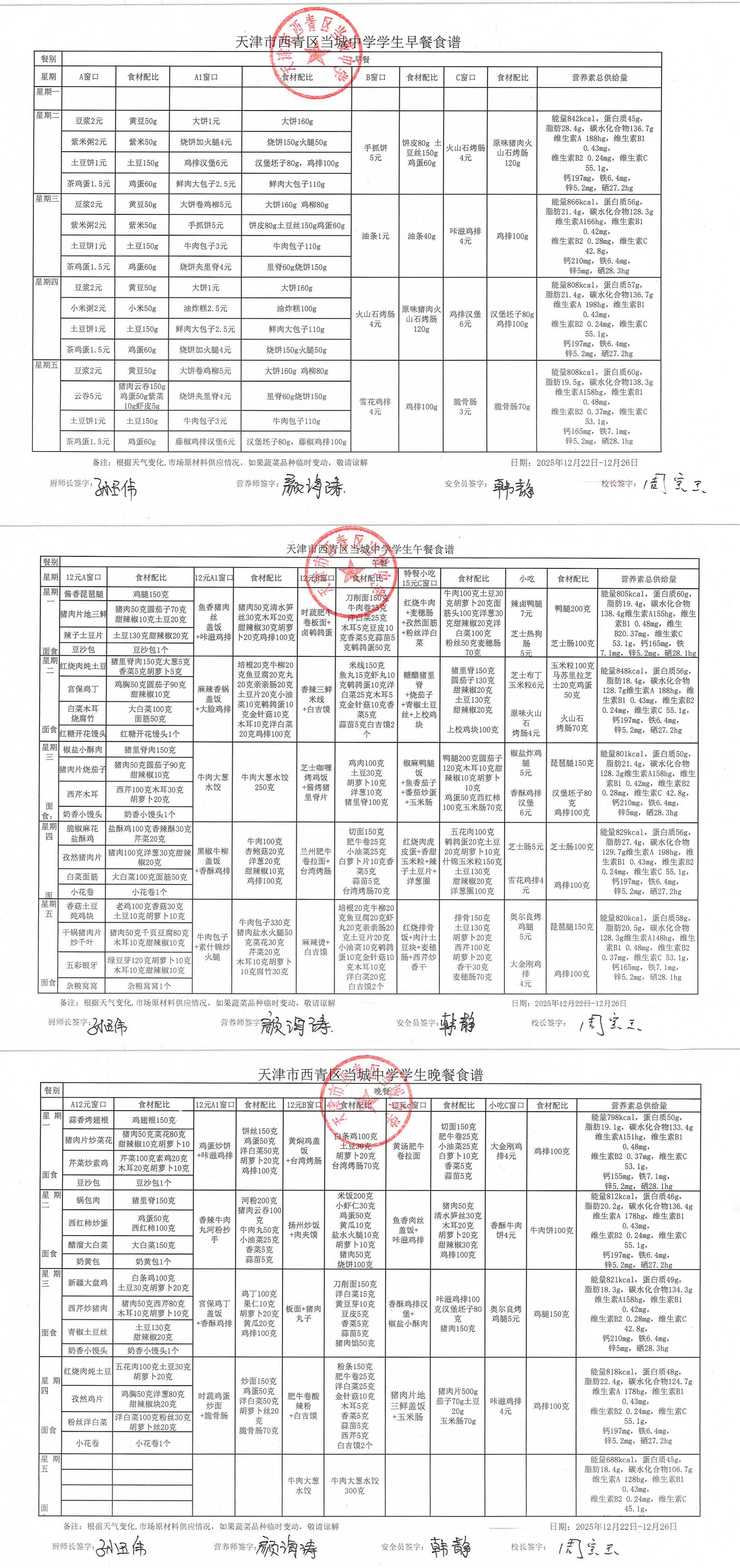 当城中学2025年12月22日-12月26日学生午餐食谱